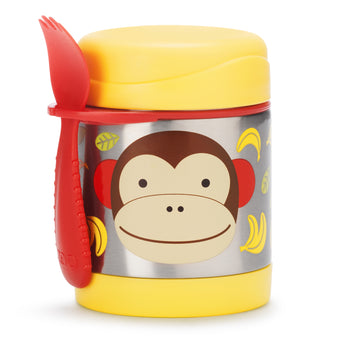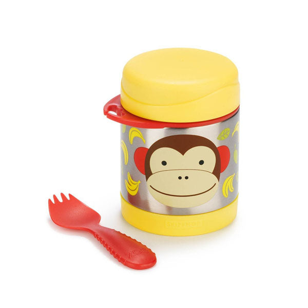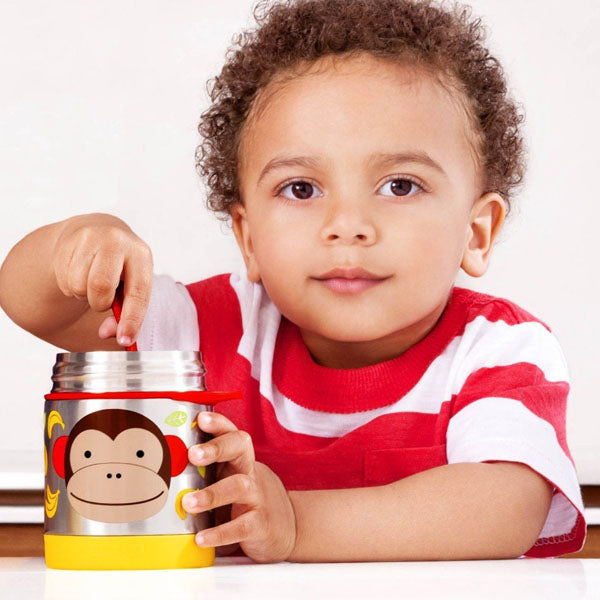 Este práctico recipiente térmico de Skip Hop mantiene la comida caliente por 7 horas o fría por 5. Incluye spork, soporte para utensilios y un diseño divertido con personajes del zoológico. Ideal para niños desde los 3 años.