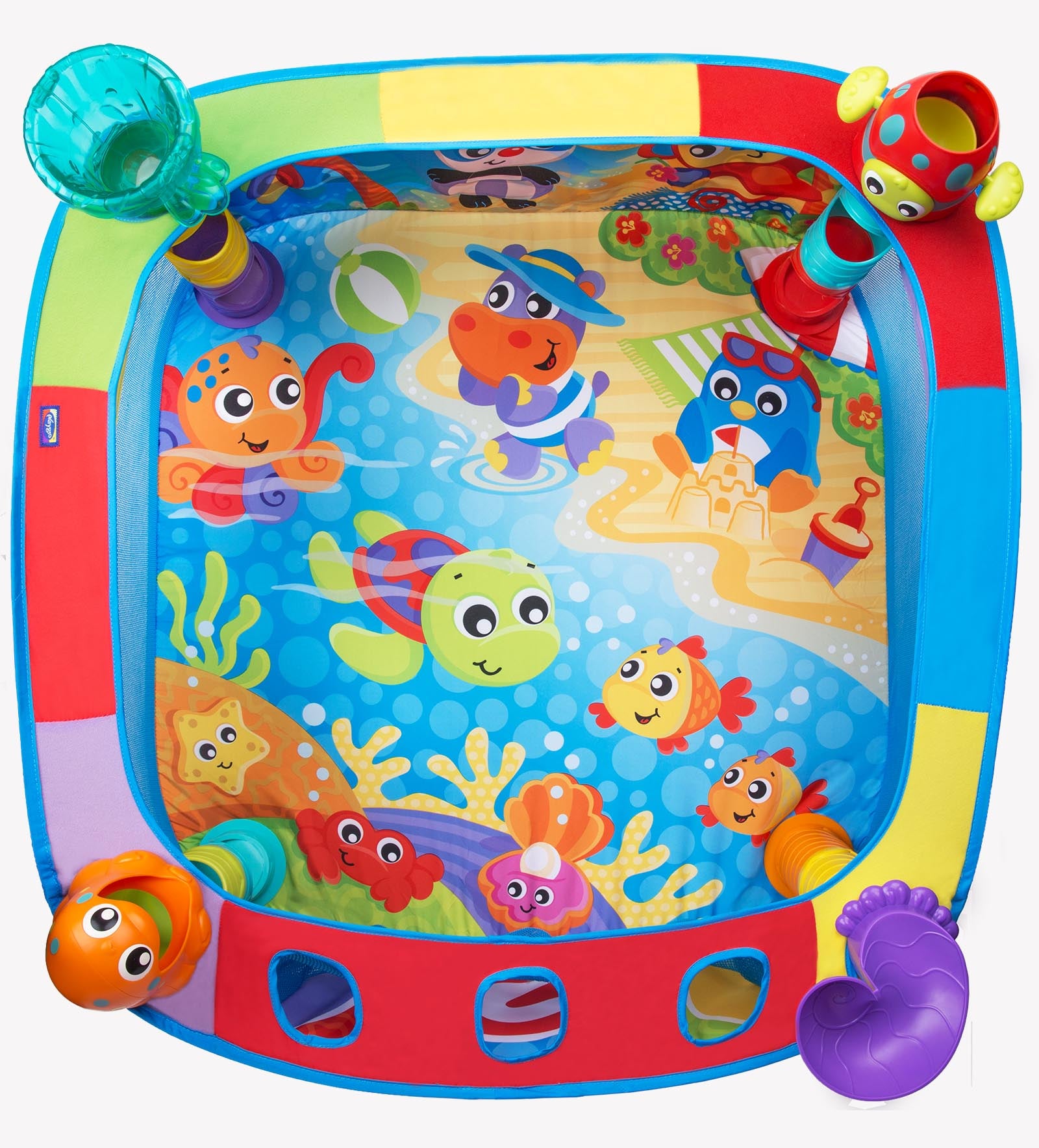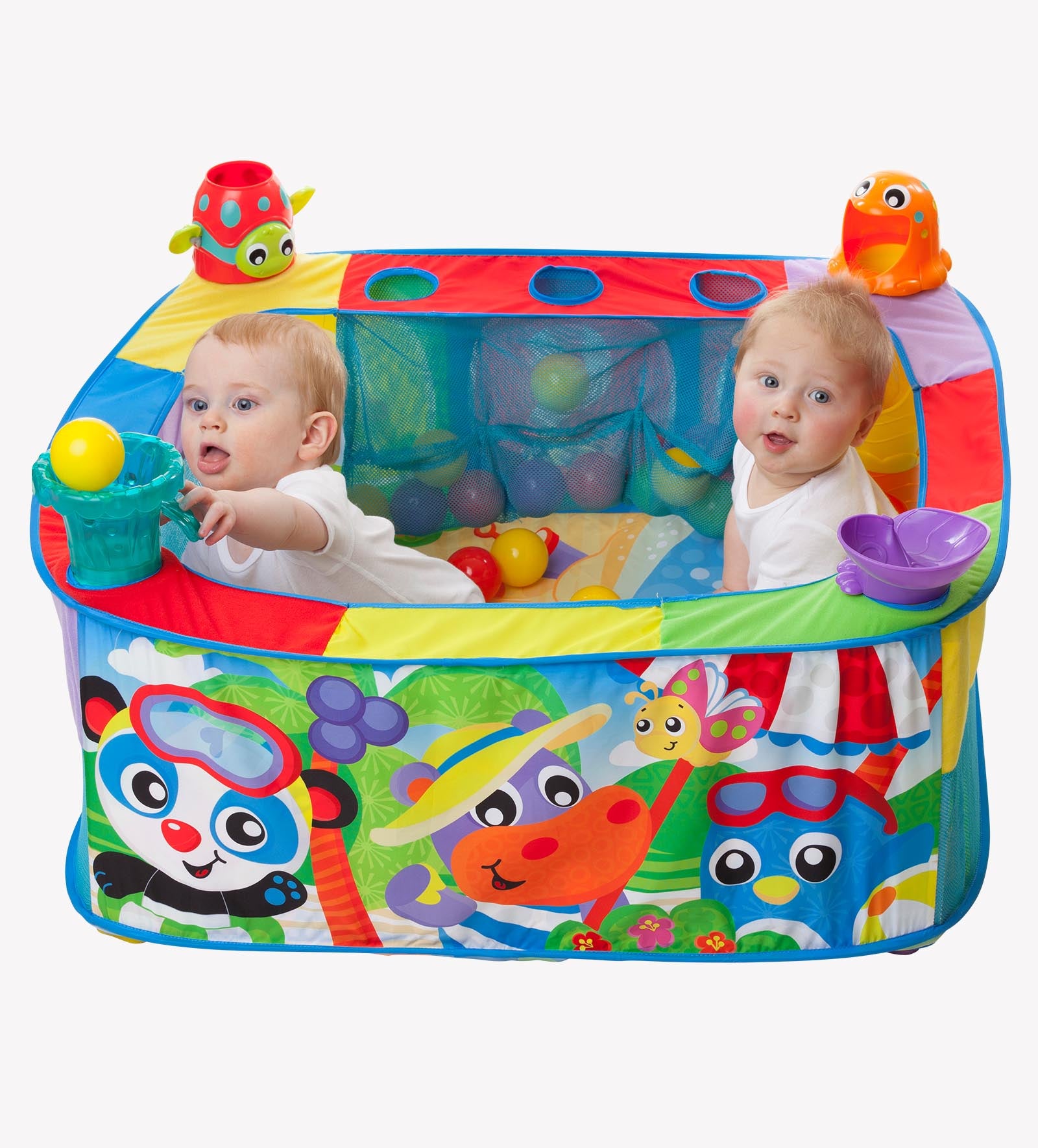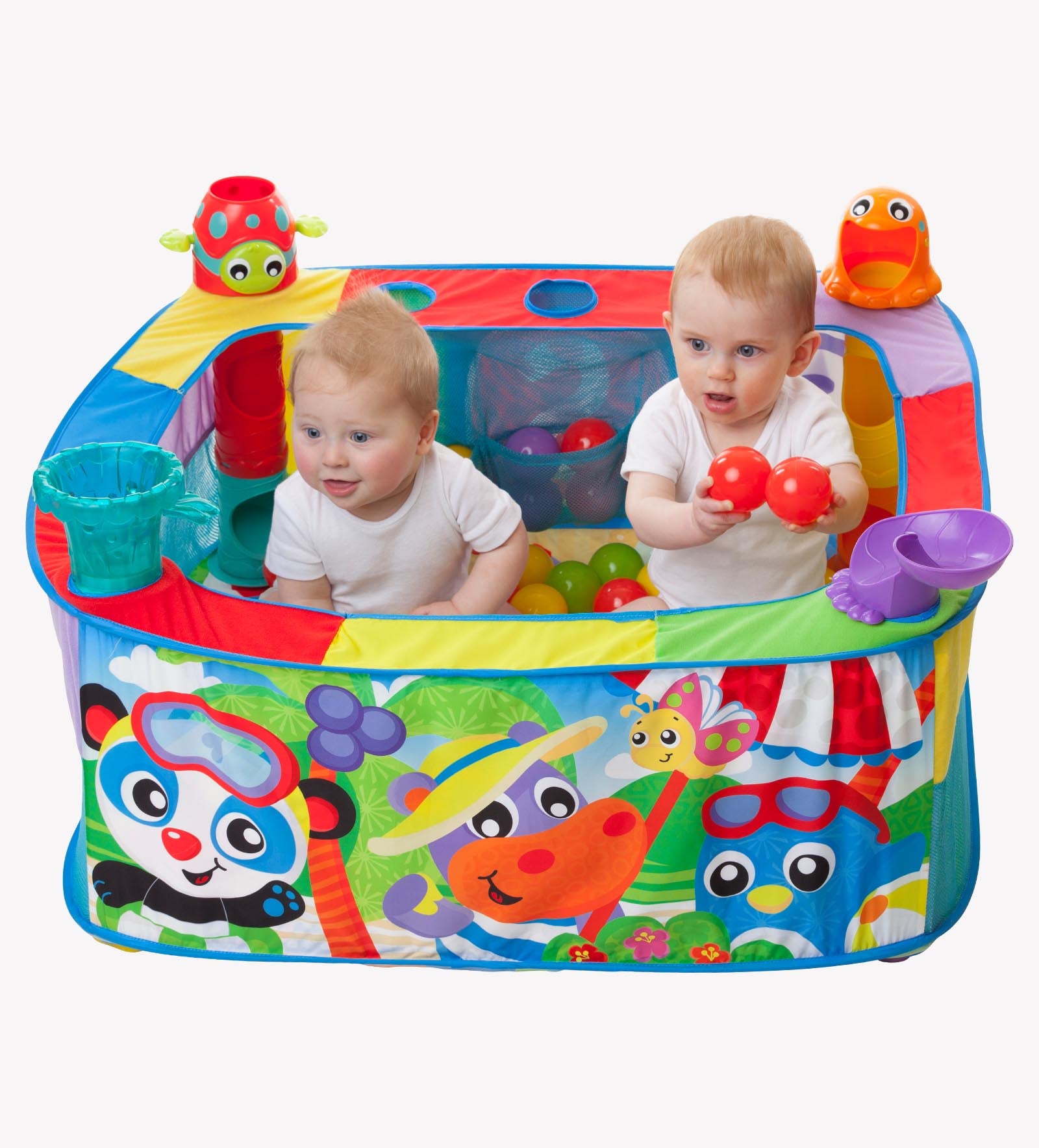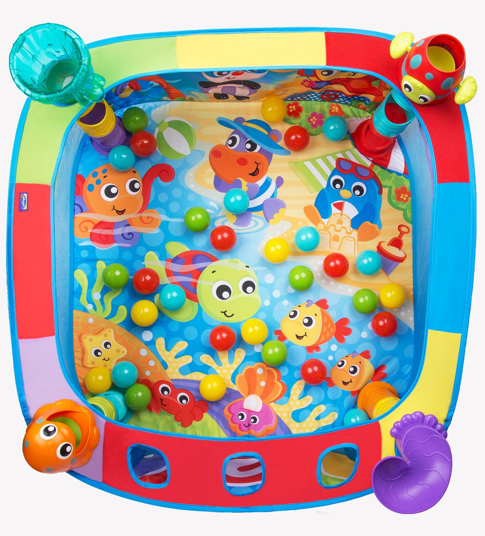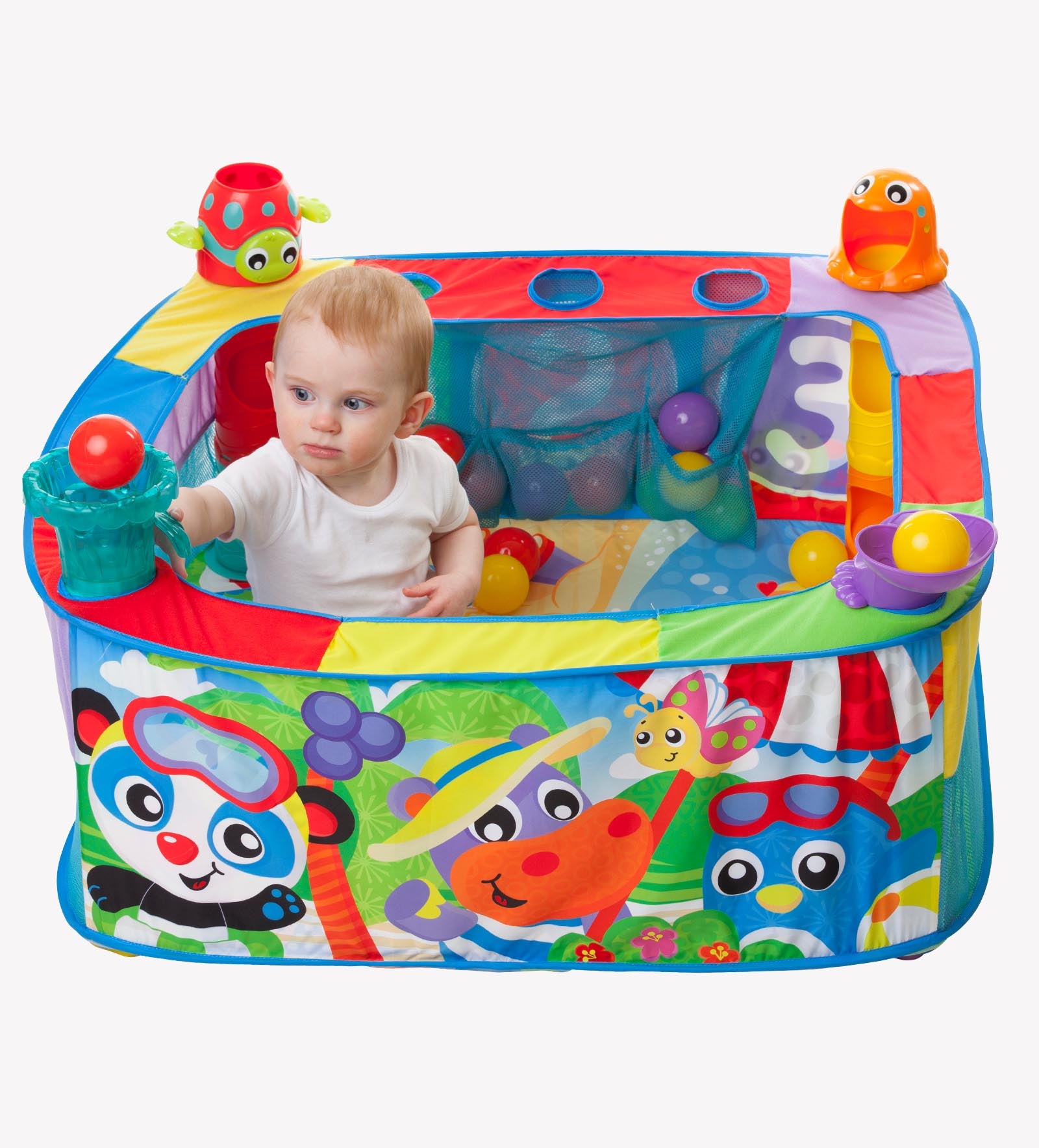 Ofrece 4 estaciones de juego para soltar, deslizar y hacer explotar pelotas de colores. Incluye 30 pelotas, personajes divertidos y diseño vibrante que estimulan la imaginación del bebé. Se pliega fácilmente y cuenta con bolsillos para guardado práctico.