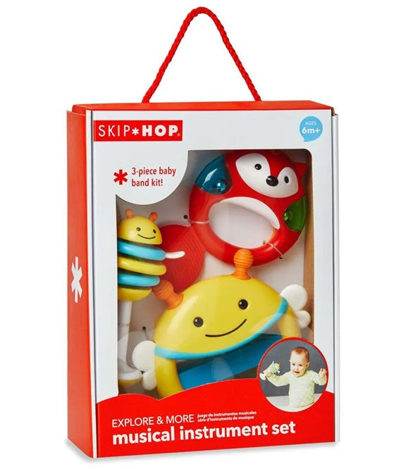 Juego de instrumentos musicales de fácil agarre, diseñado para manos pequeñas, que incluye tambor sonajero, pandereta y maraca para estimular la diversión y la creatividad desde los 6 meses.