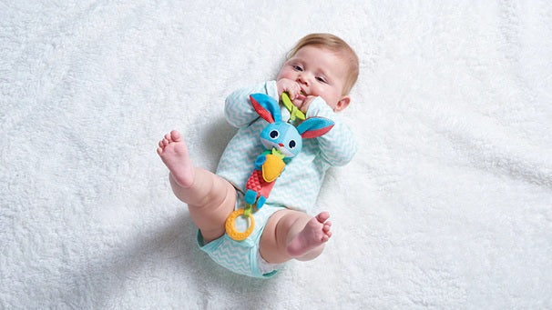 Juguete portátil con colores de alto contraste y dulce sonido que estimula los sentidos, las habilidades motoras y presenta a Tomás, la simpática liebre inspirada en Thomas Edison.
