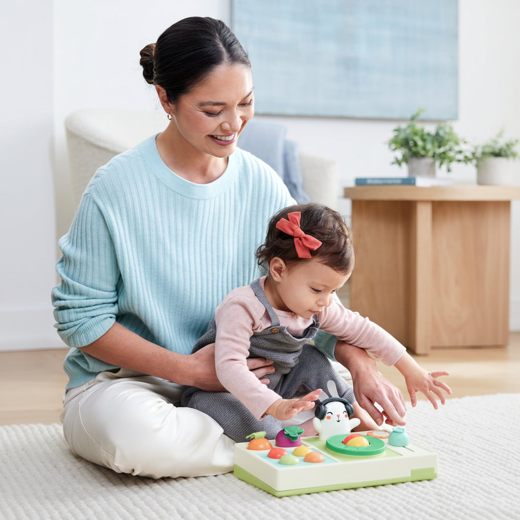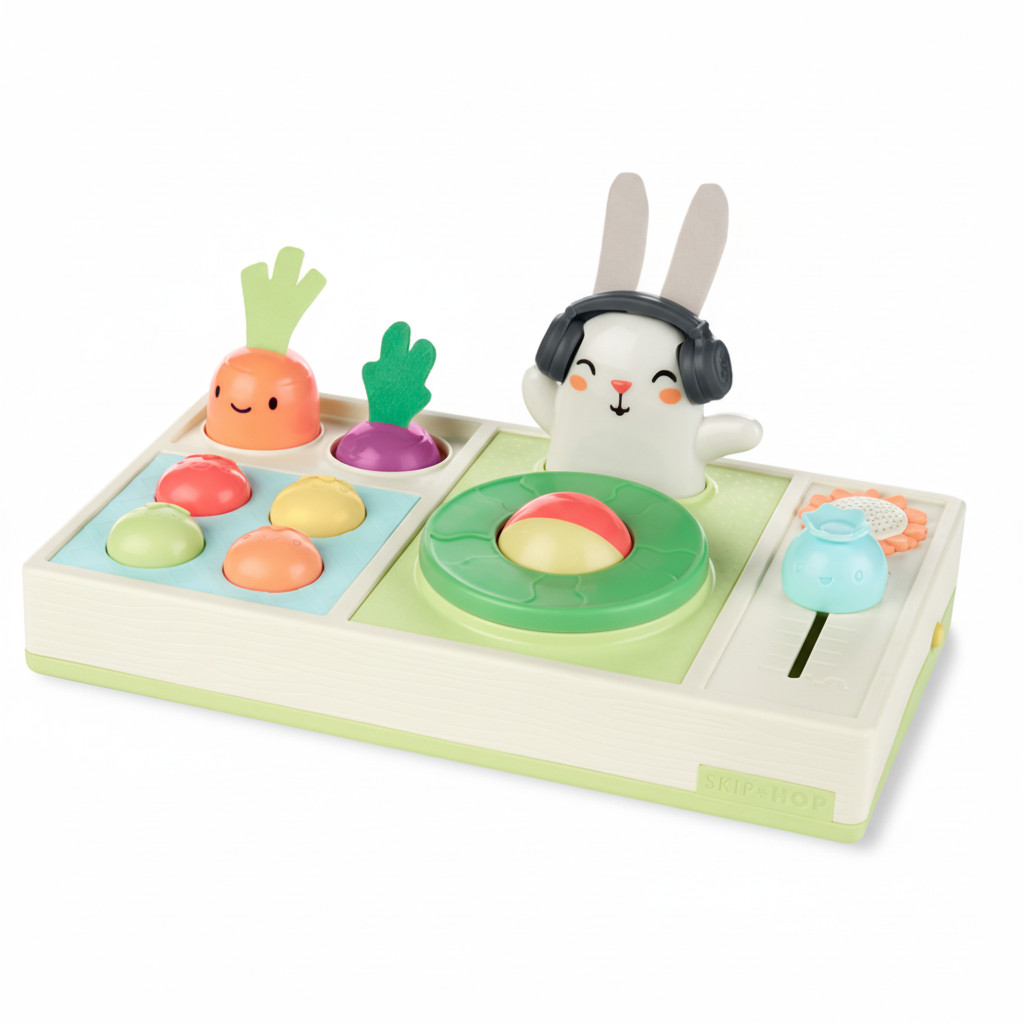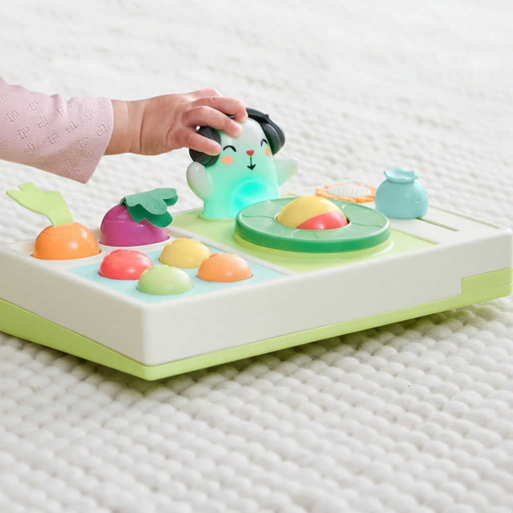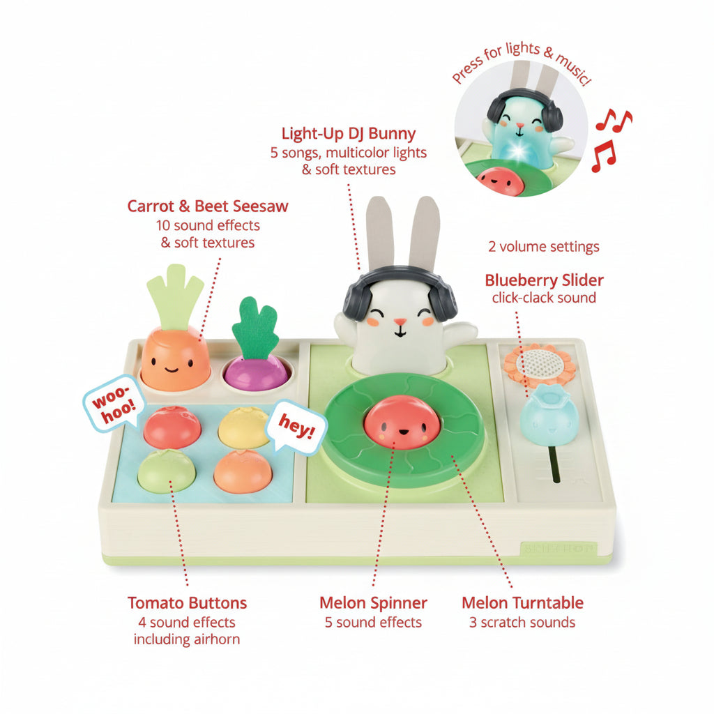 Este divertido set de DJ para bebés combina música, luces y sonidos con un colorido diseño de frutas y verduras. Con más de 30 funciones, invita a los pequeños a explorar, presionar botones y crear su propia fiesta musical.