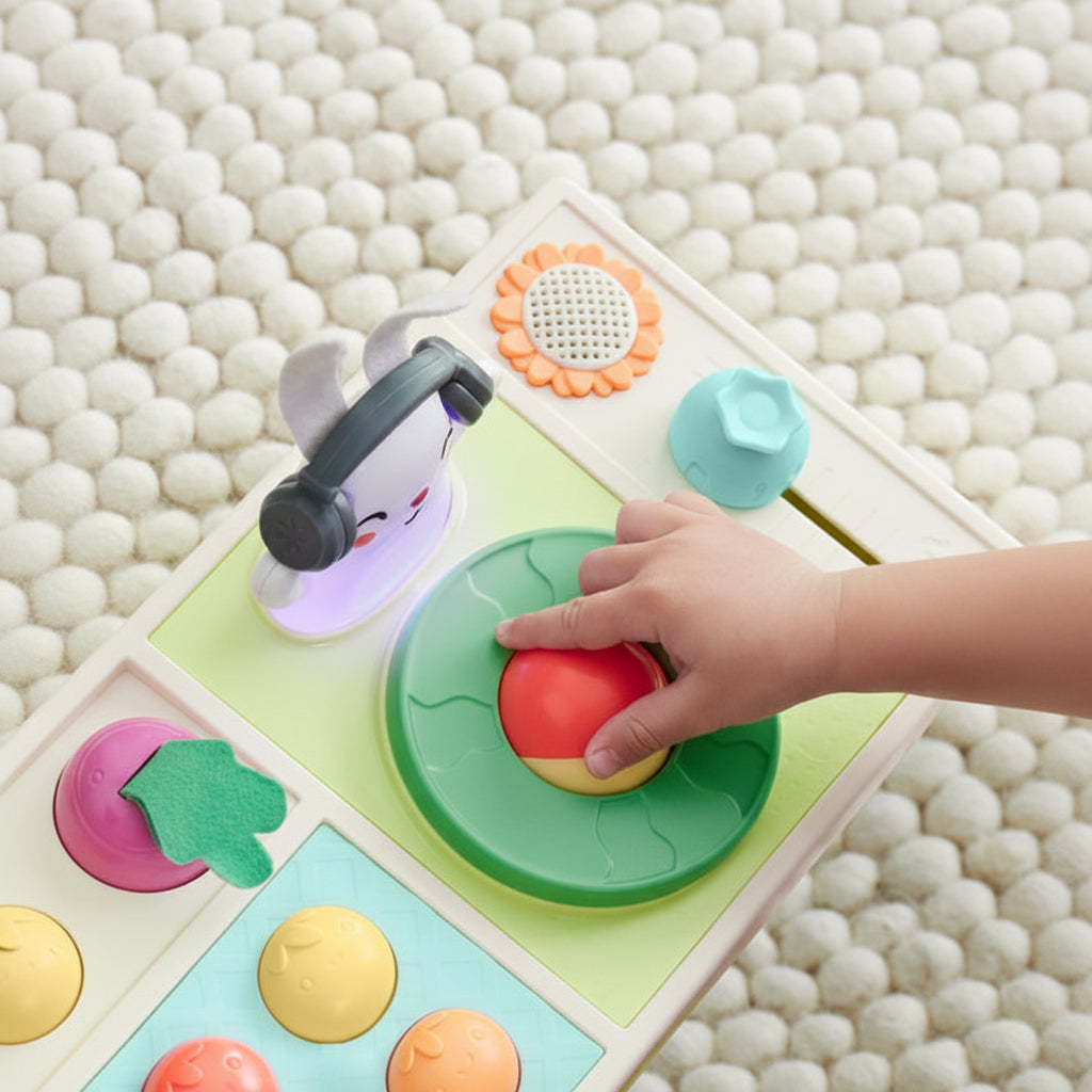 Con botones interactivos, plato giratorio y sonidos tipo DJ, permite que el bebé experimente con música y ritmo de forma entretenida.