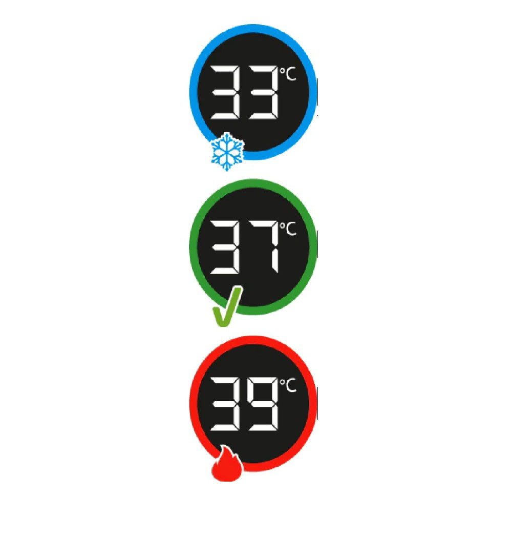 El indicador de color te permite saber si la temperatura es segura y cómoda para el bebé. Azul significa frío, rojo significa caliente y verde significa que es perfecta (35 – 38 °C).
