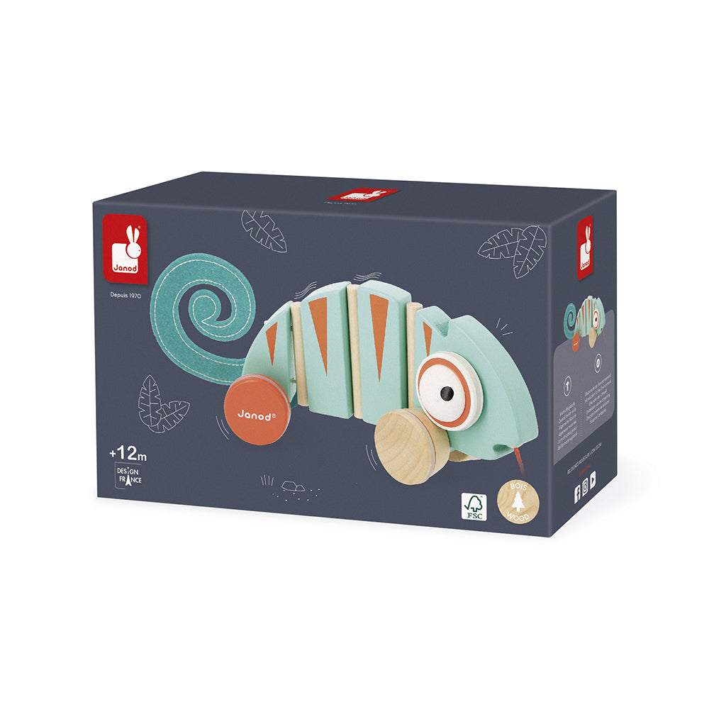 Este camaleón de arrastre, con ojos giratorios y cola de fieltro, fomenta el movimiento y la diversión mientras los niños exploran.
