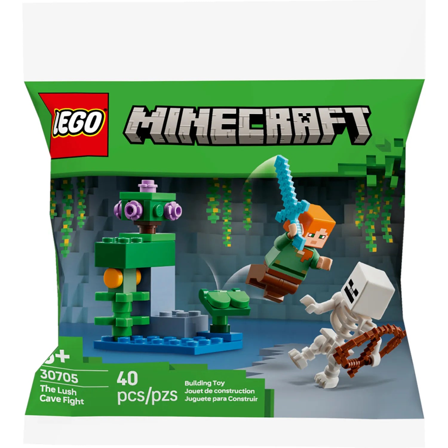 Alex usa su espada de diamante para luchar contra un esqueleto armado con un arco en una cueva frondosa que contiene arcilla, musgo, flores, enredaderas, bayas luminosas y una plantaforma grande plegable.