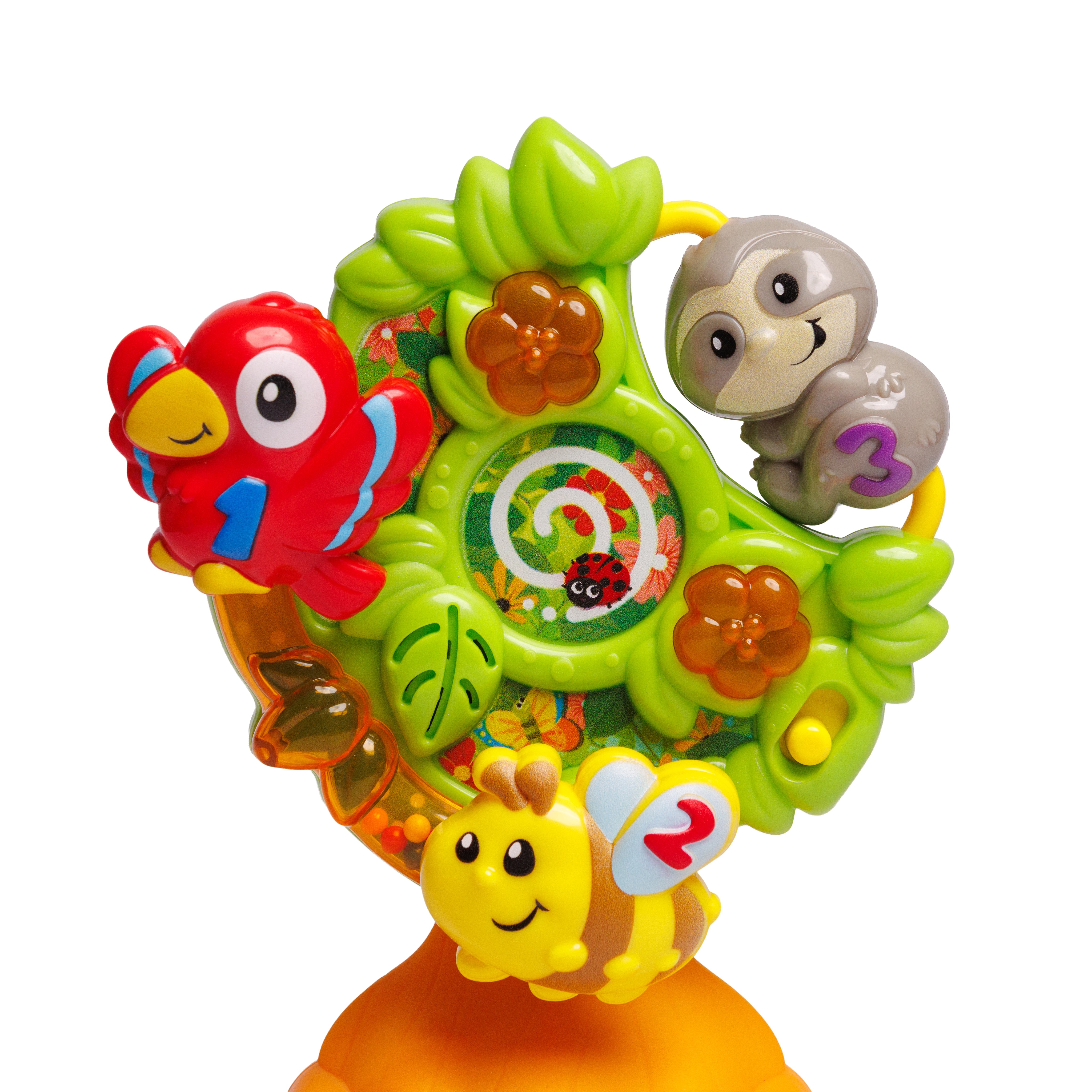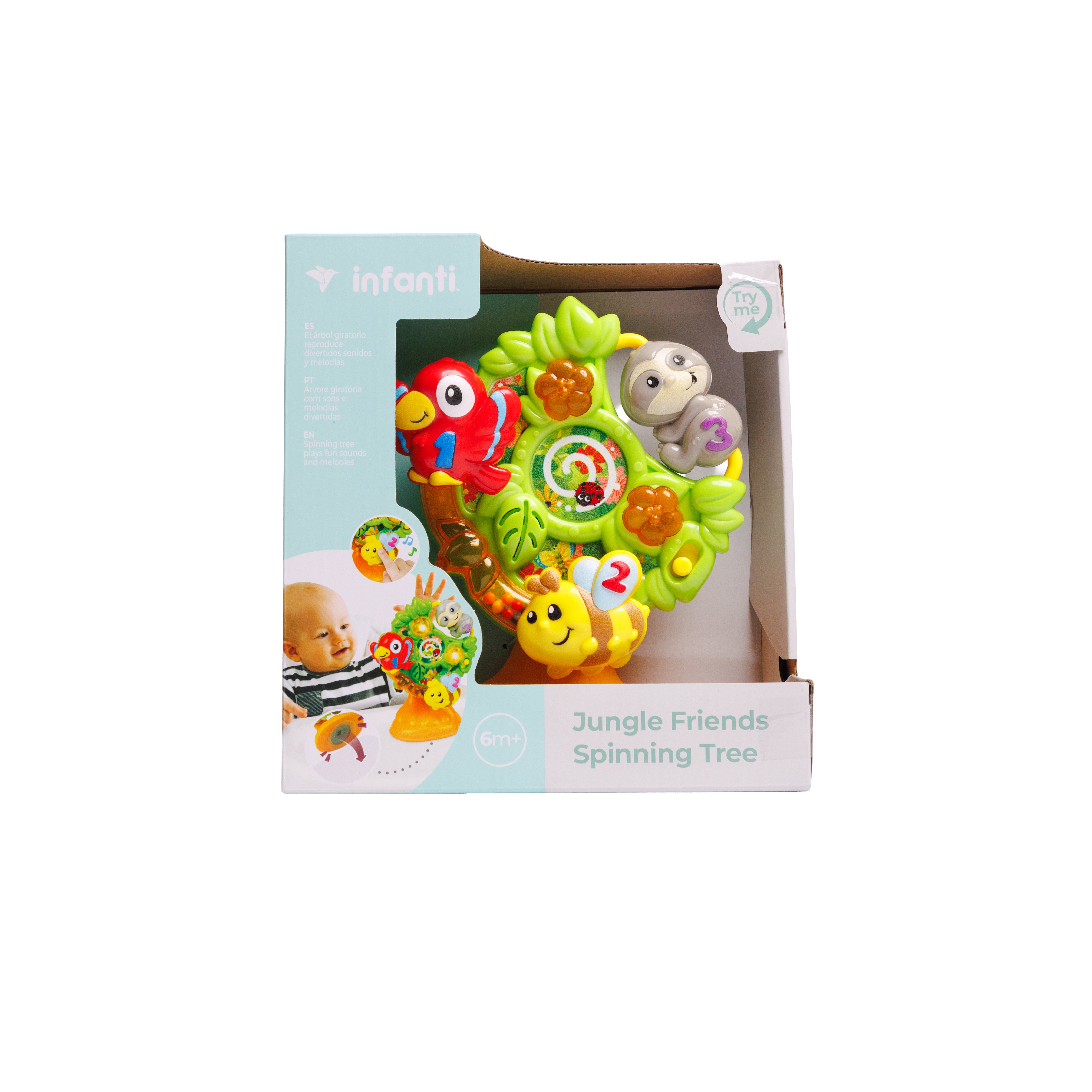 Un árbol giratorio interactivo con adorables personajes de la jungla: ¡gira el árbol para disfrutar de divertidos sonidos, melodías y luces parpadeantes!