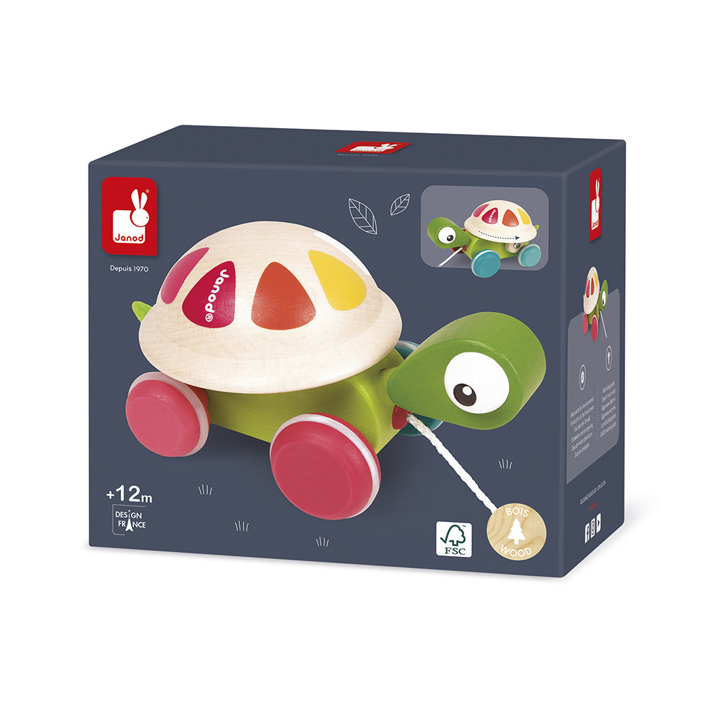 Este sonajero de arrastre en forma de tortuga estimula la motricidad y el descubrimiento visual. Al avanzar, su caparazón gira y cambia de color, sorprendiendo a los más pequeños. Fabricado en madera con pintura al agua, segura y no tóxica.