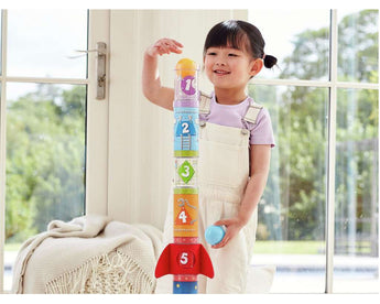 Este cohete apilable con tubos numerados y animales divertidos permite ver cómo una pelota flota con aire, ayudando a despertar la curiosidad por la física mientras desarrolla motricidad fina, reconocimiento de formas y primeros conceptos de conteo.