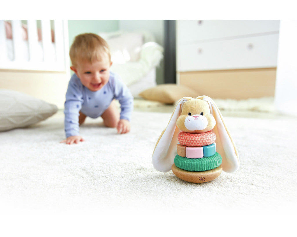 Un simpático juego de apilar con una robusta base de madera de haya, tres coloridas anillas y un conejo blandito.