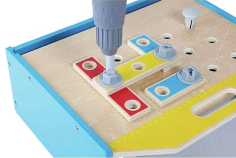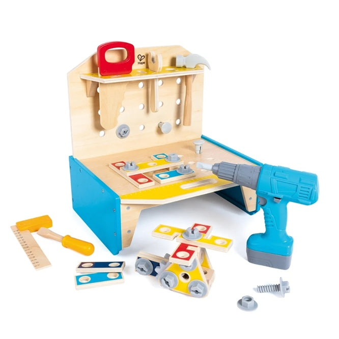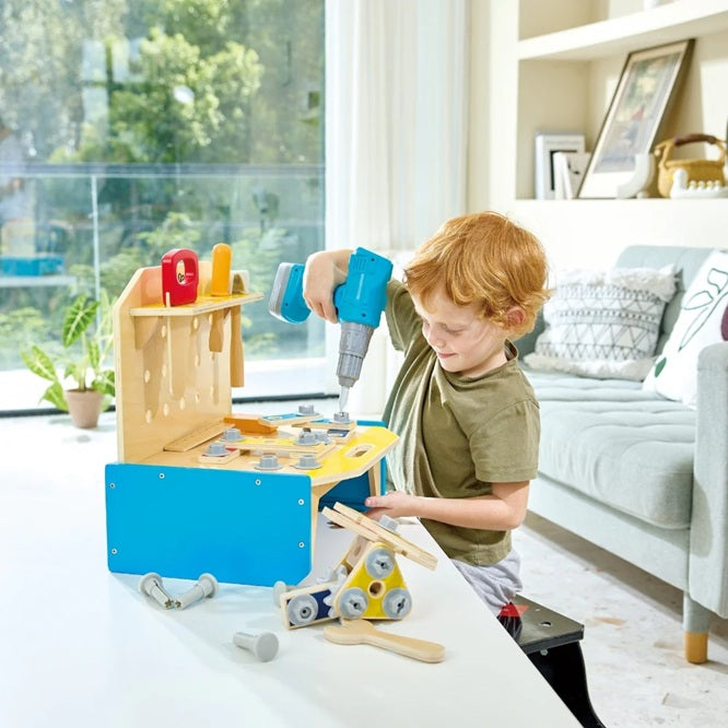 Incluye taladro, martillo, destornillador, bloques, tornillos y engranajes para crear múltiples construcciones.