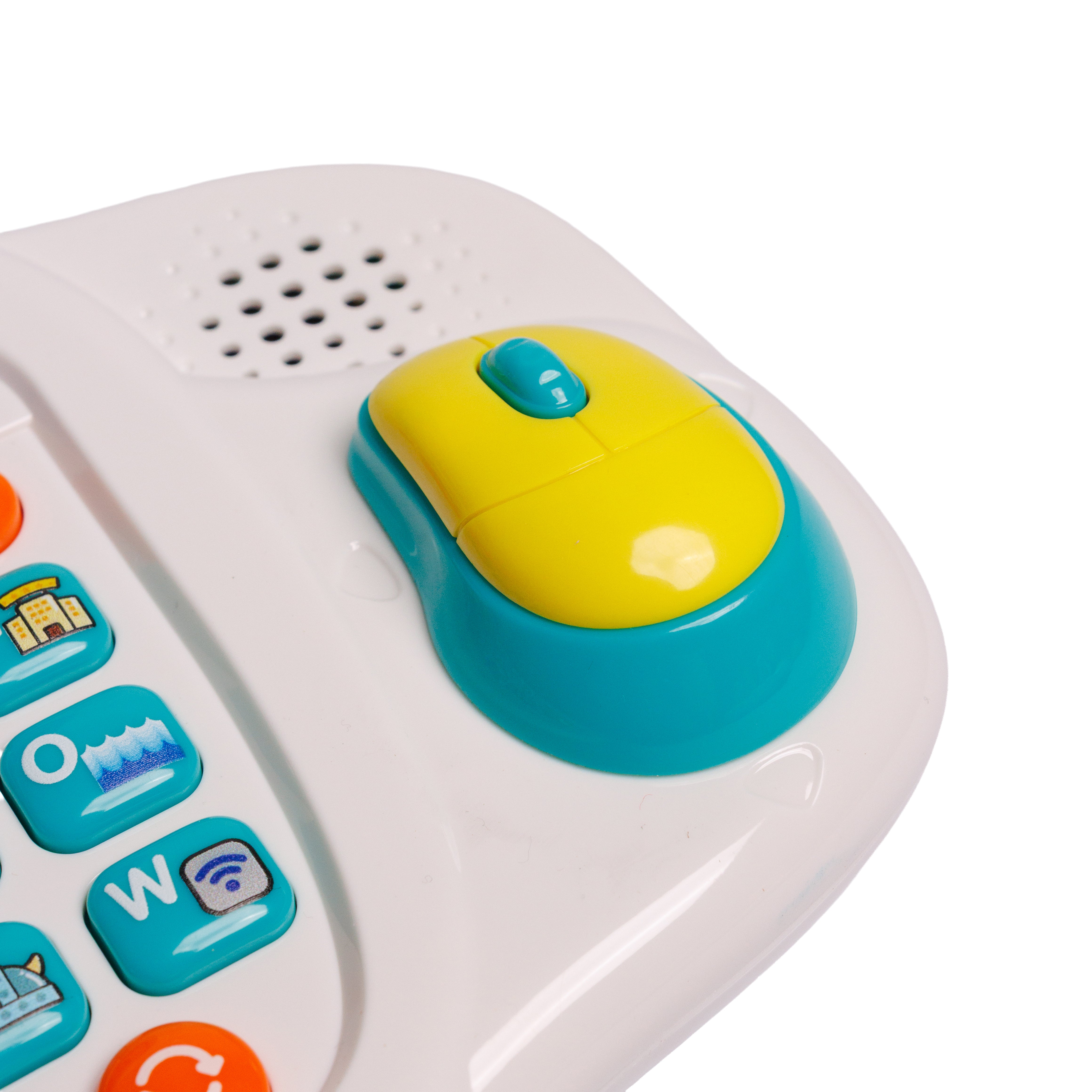 Laptop bilingüe con actividades educativas, animaciones y controles interactivos que enseñan letras, números, formas y vocabulario mientras el niño juega.