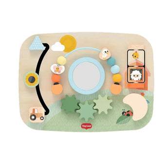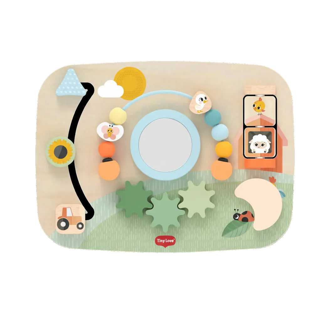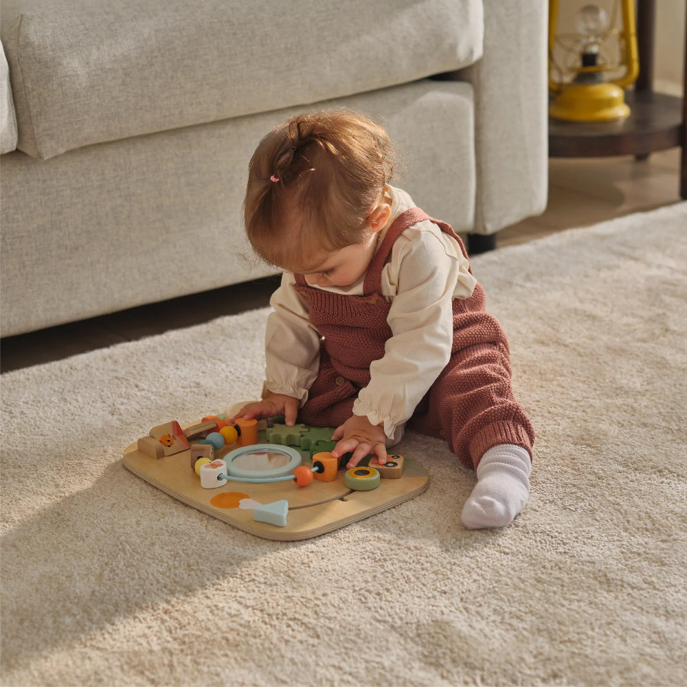 Panel sensorial de madera con actividades interactivas que estimulan el desarrollo cognitivo y la motricidad fina desde los primeros meses.