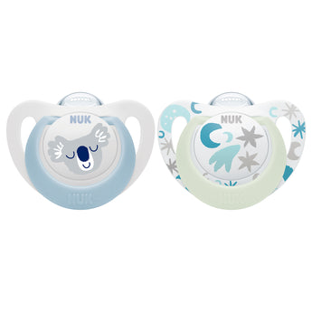 Brilla en la oscuridad para que sea más fácil ubicar en la noche. (El brillo es en las asitas del chupón noche.)