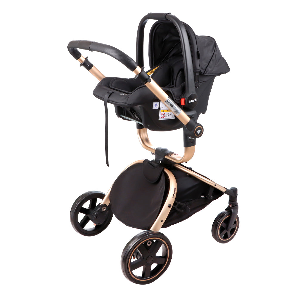 Estructura de aluminio ultralivieano Mango y asiento reversible Arnés de 5 puntas Gran canasto inferior cerrado Respaldo regulable en 4 posiciones Barra parachoques removible. Rotación 360° Soporta hasta 15 kilos Silla nido, con base Soporta hasta los 13 kilos