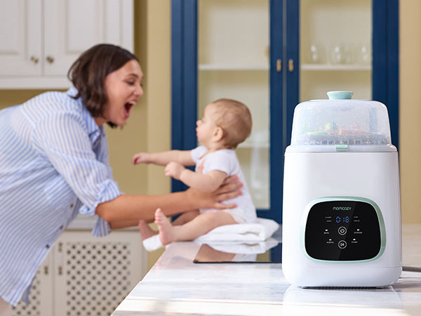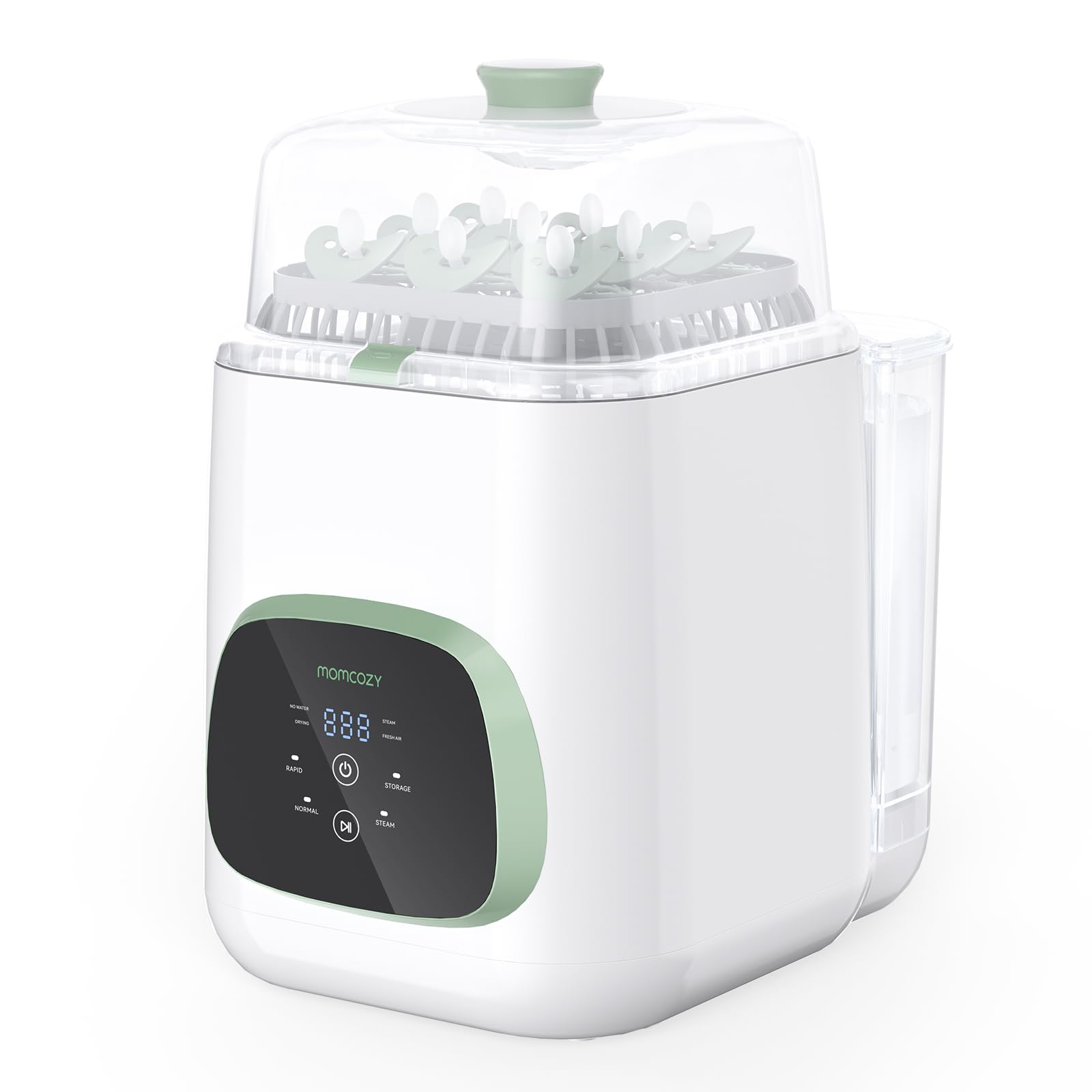 Lavadora, esterilizador y secadora de biberones Momcozy. Limpieza profunda, esterilización a vapor y secado completo en un solo equipo.